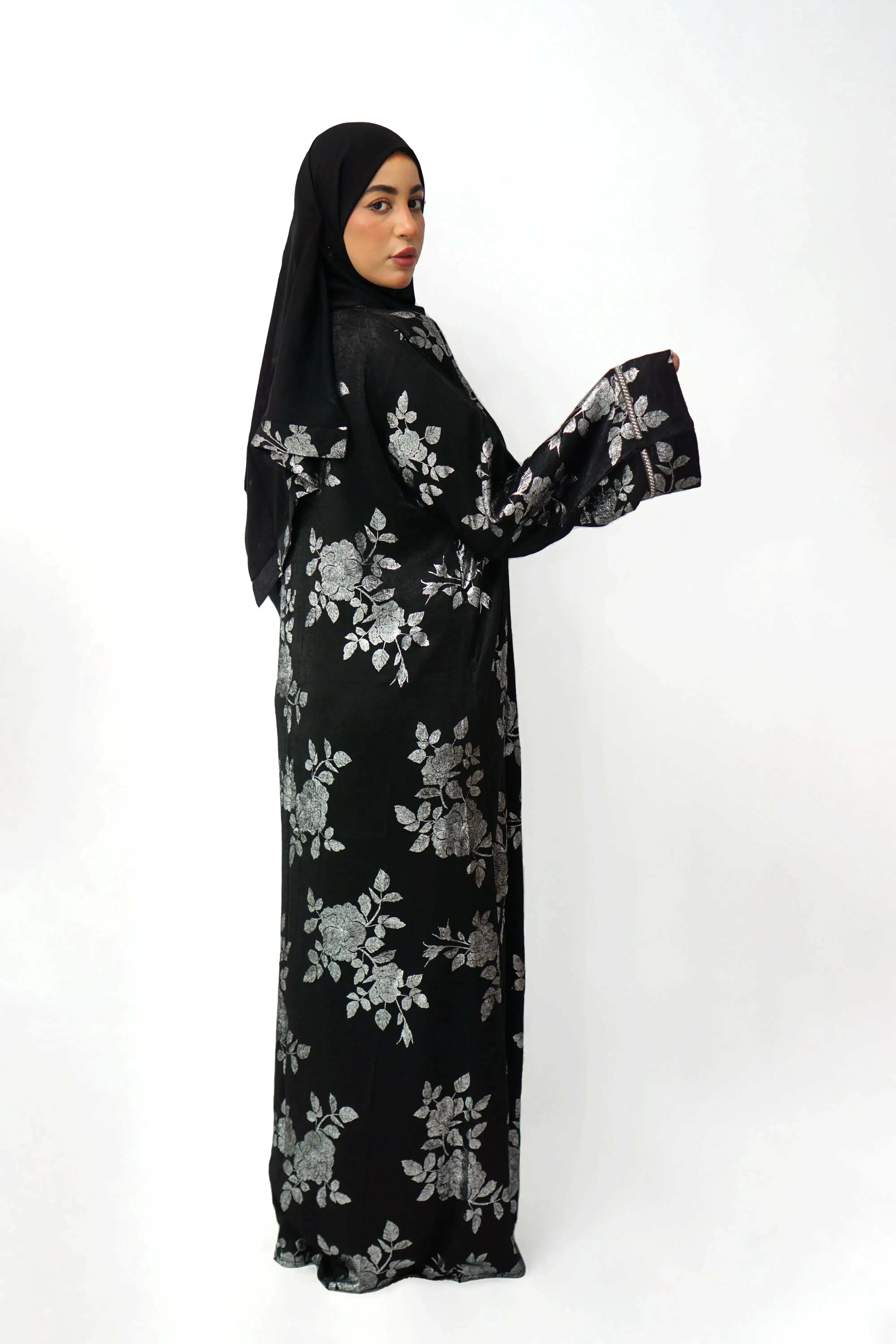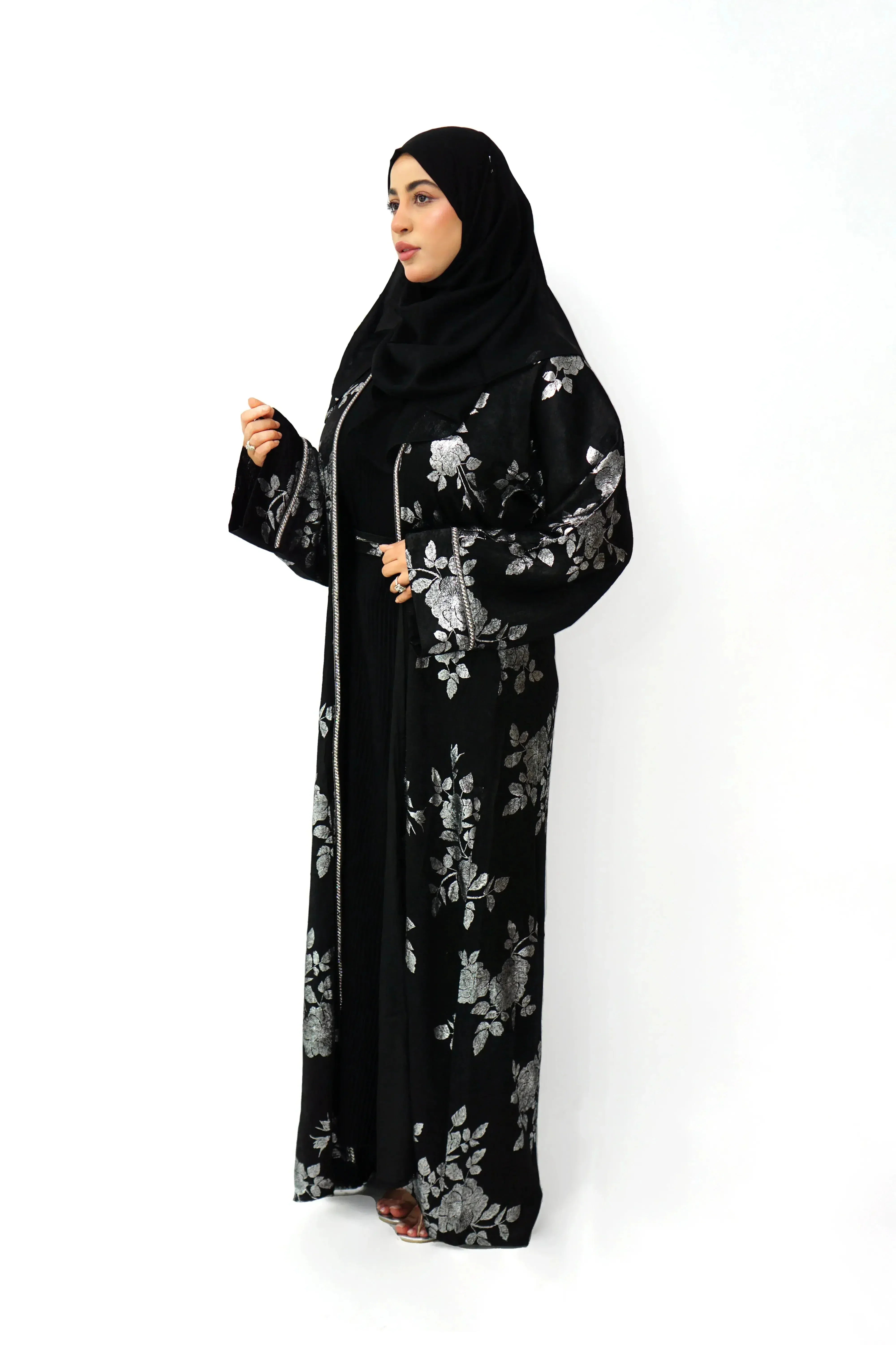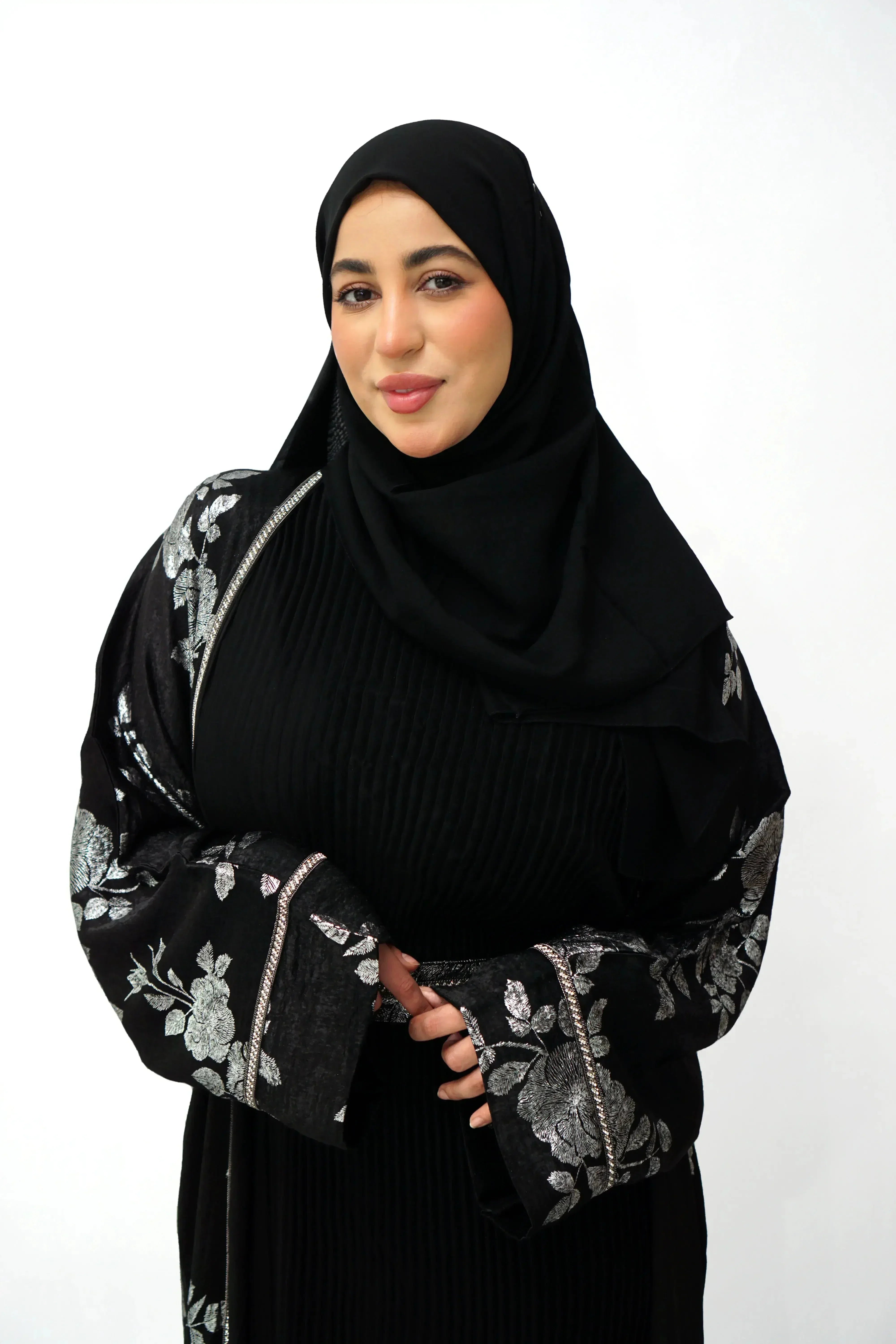 Gracefully modest and beautifully detailed, this 2-Piece Abaya Set is a perfect blend of tradition and elegance. Featuring a soft pleated inner dress and a flowy open abaya adorned with silver floral embroidery, it’s designed to make you feel confident and stylish on every occasion.