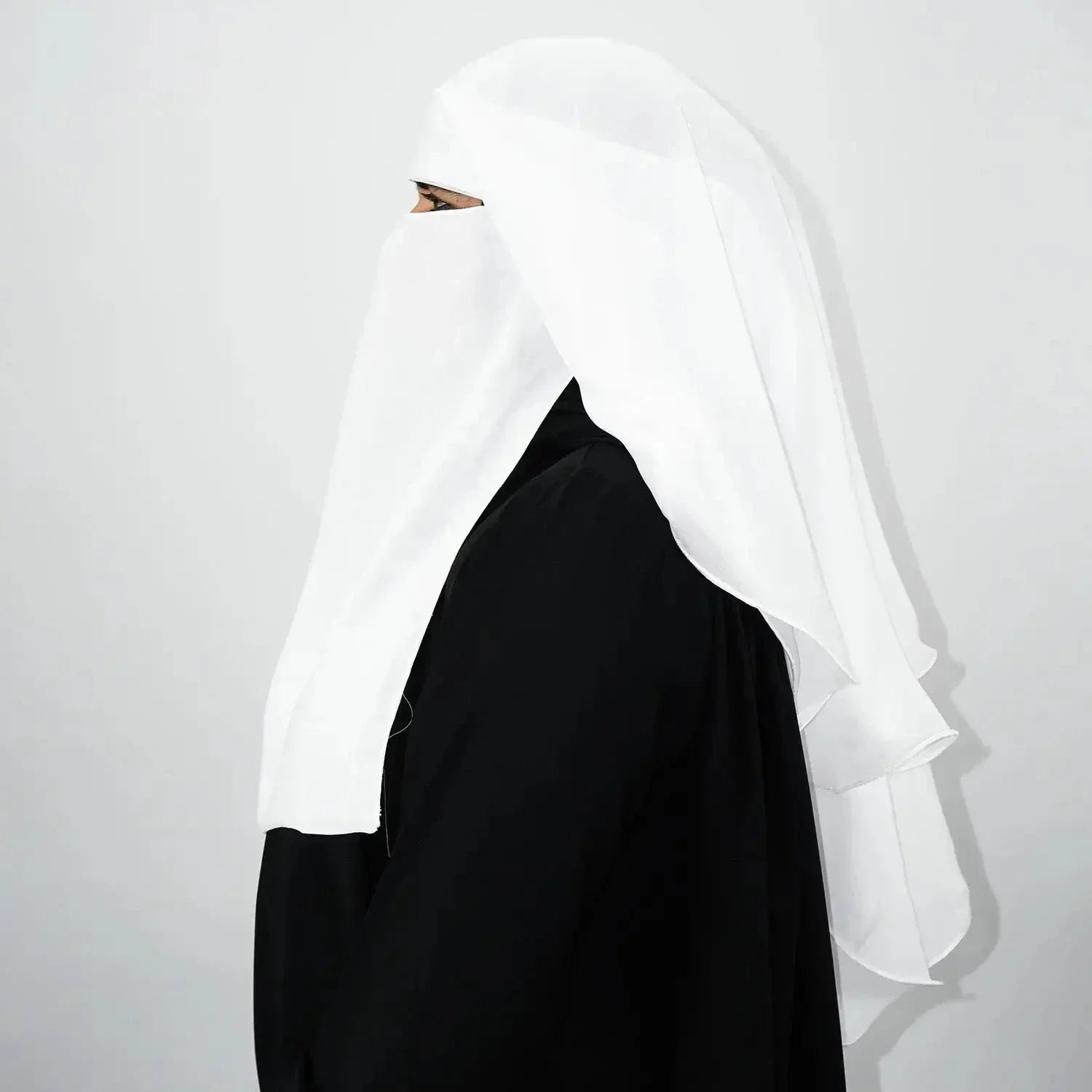 This niqab features three breathable layers that provide superior coverage while maintaining a lightweight feel. Its tie-back design ensures a secure and adjustable fit, making it ideal for daily wear or special occasions. The pristine white color adds a touch of sophistication, complementing various outfits effortlessly.