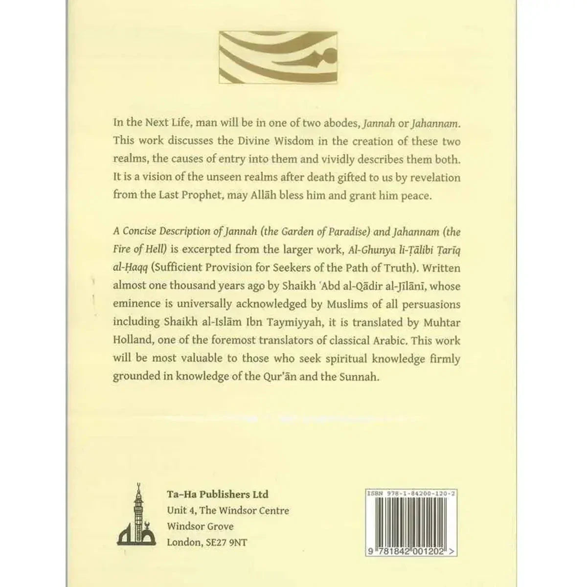 A Concise Description of Jannah (the Garden of Paradise) and Jahannam (the Fire of Hell) is excerpted from the larger work, Al-Ghunya li-Talibi Tariq al-Haqq (Sufficient Provision for Seekers of the Path of Truth). Written almost one thousand years ago by Shaikh 'Abd al-Qadir al-Jilani, whose eminence is universally acknowledged by Muslims of all persuasions including Shaikh al-Islam ibn Taymiyyah, it is translated by Muhtar Holland, one of the foremost translators of classical Arabic. This work will be most valuable to those who seek spiritual knowledge firmly grounded in knowledge of the Qur'an and the Sunnah.