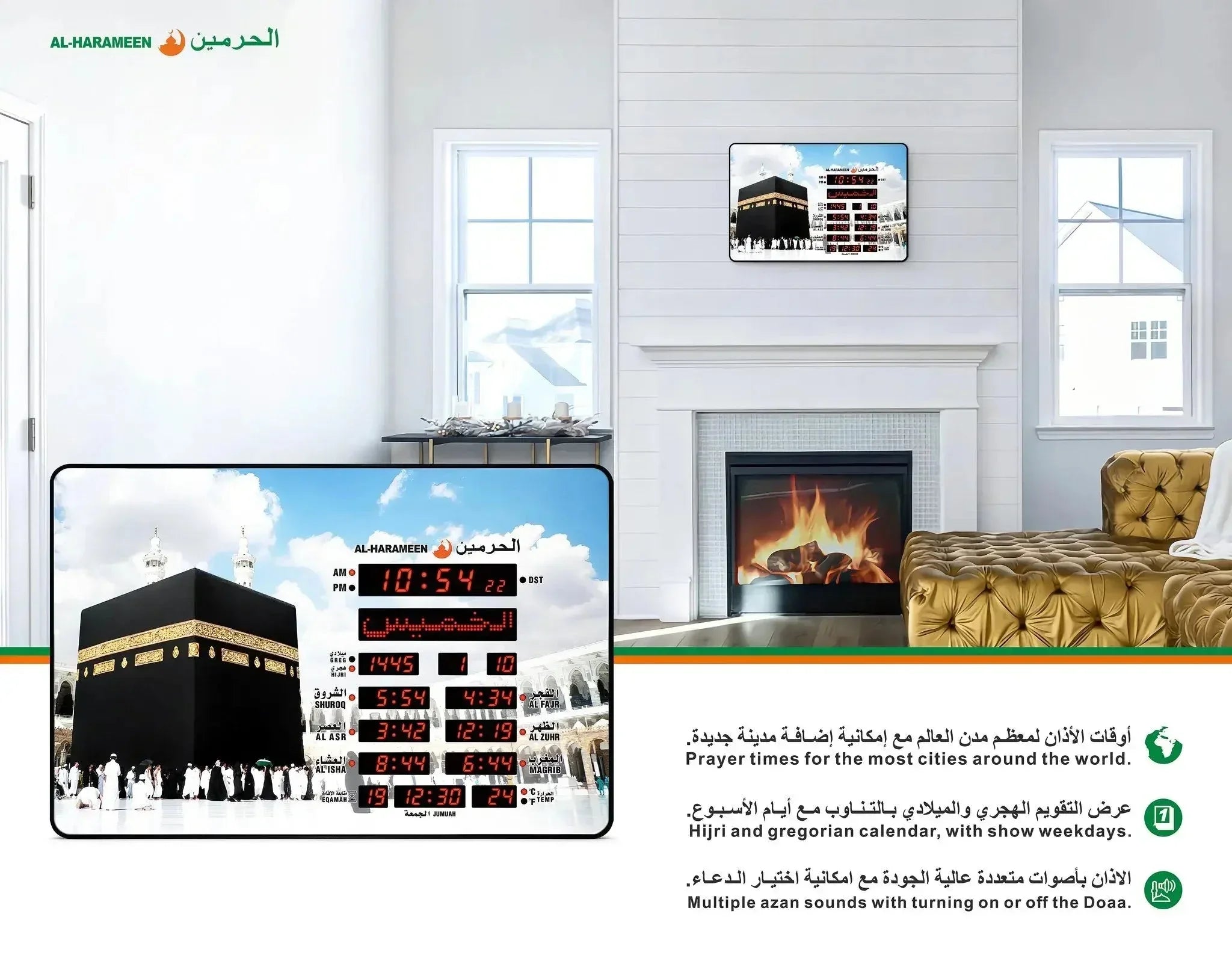 - Extra Functionalities: Displays Hijri & Gregorian calendars and room temperature.