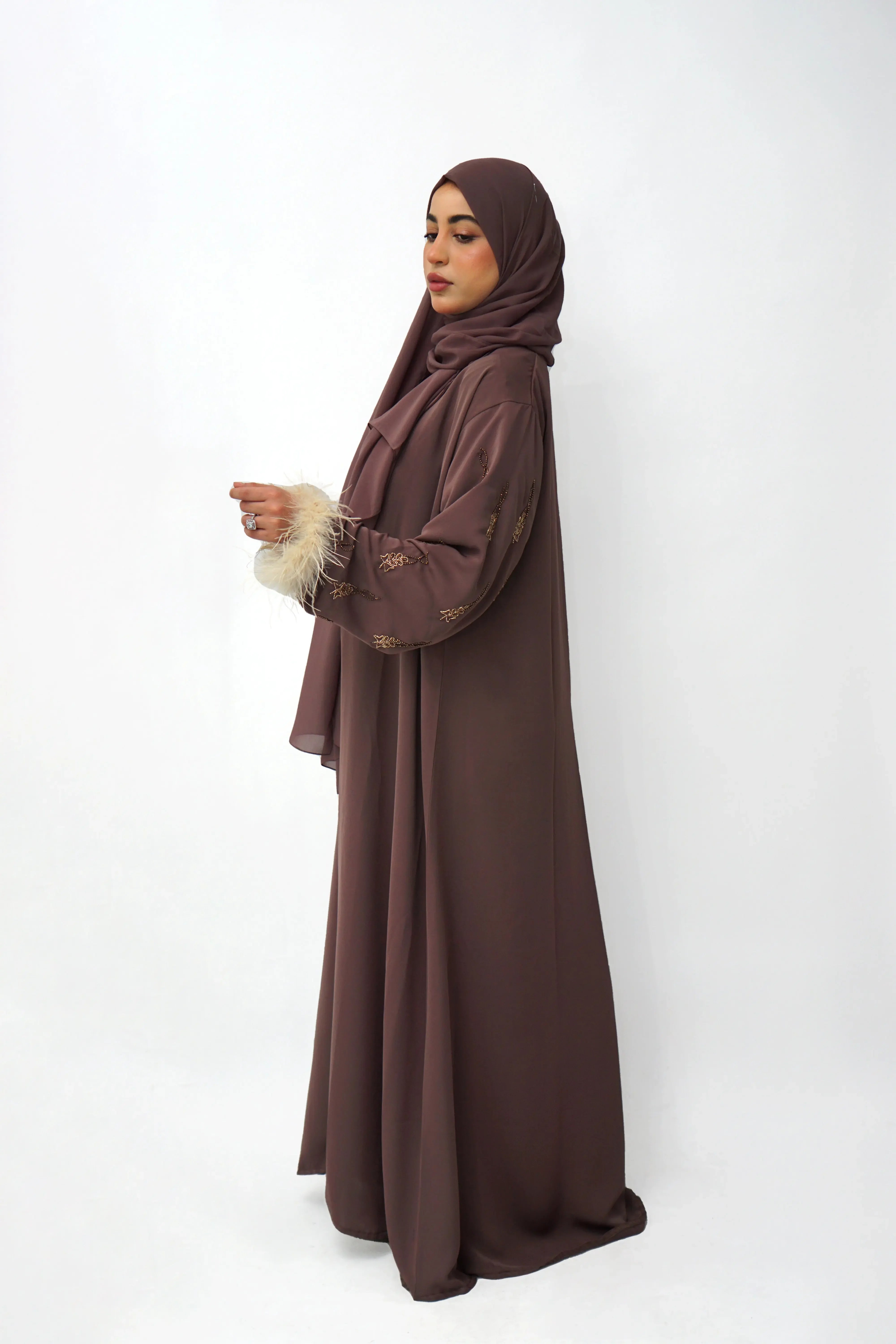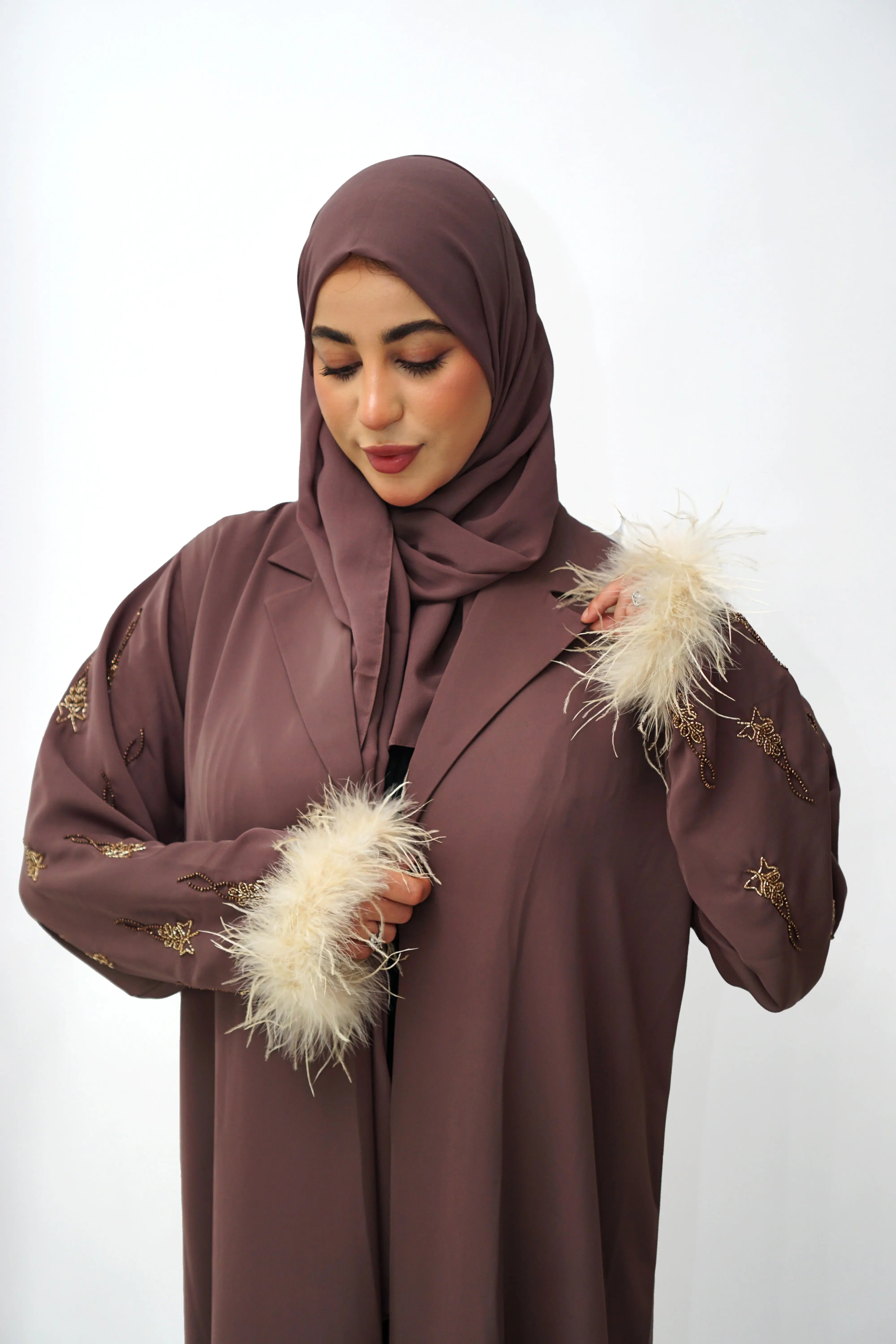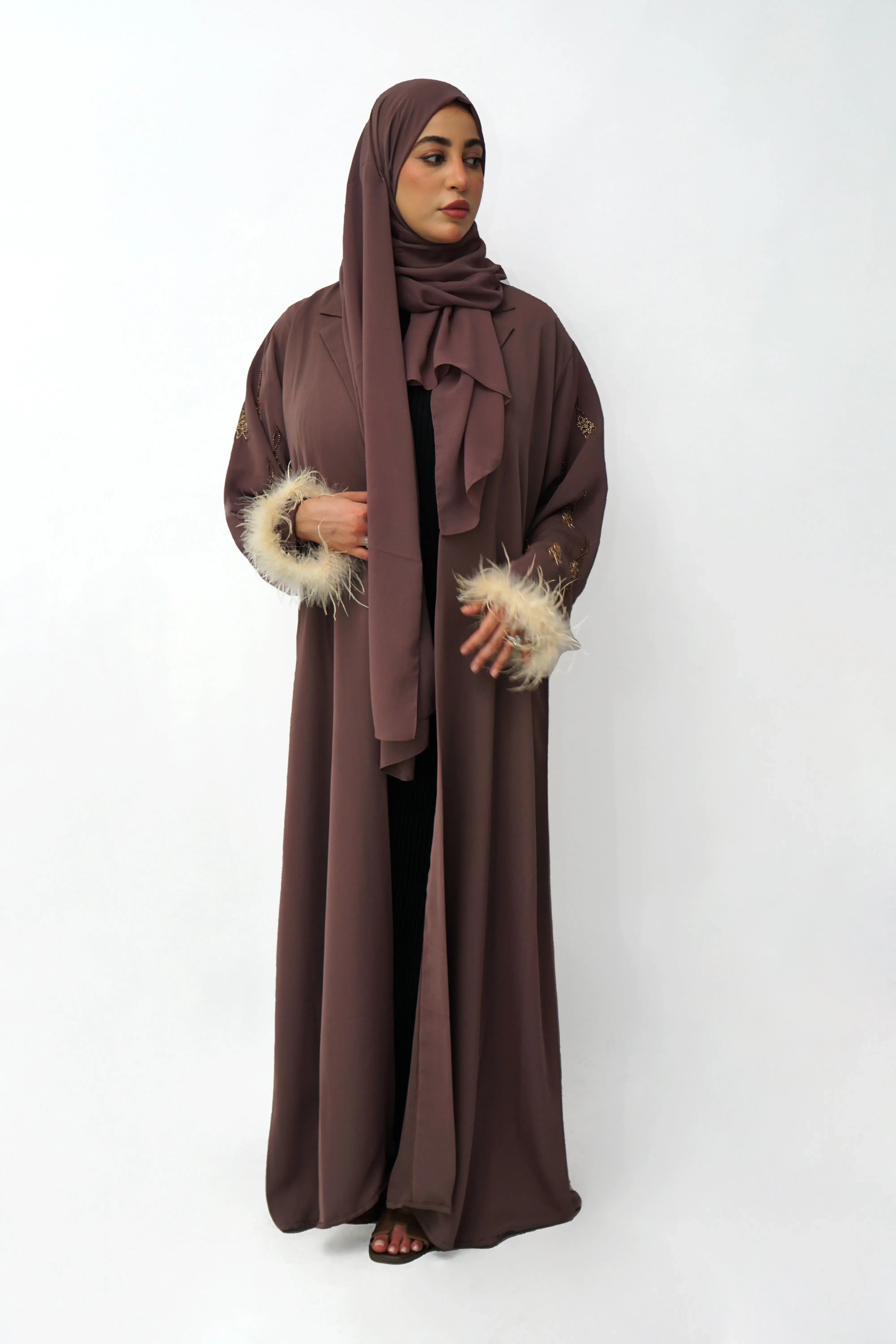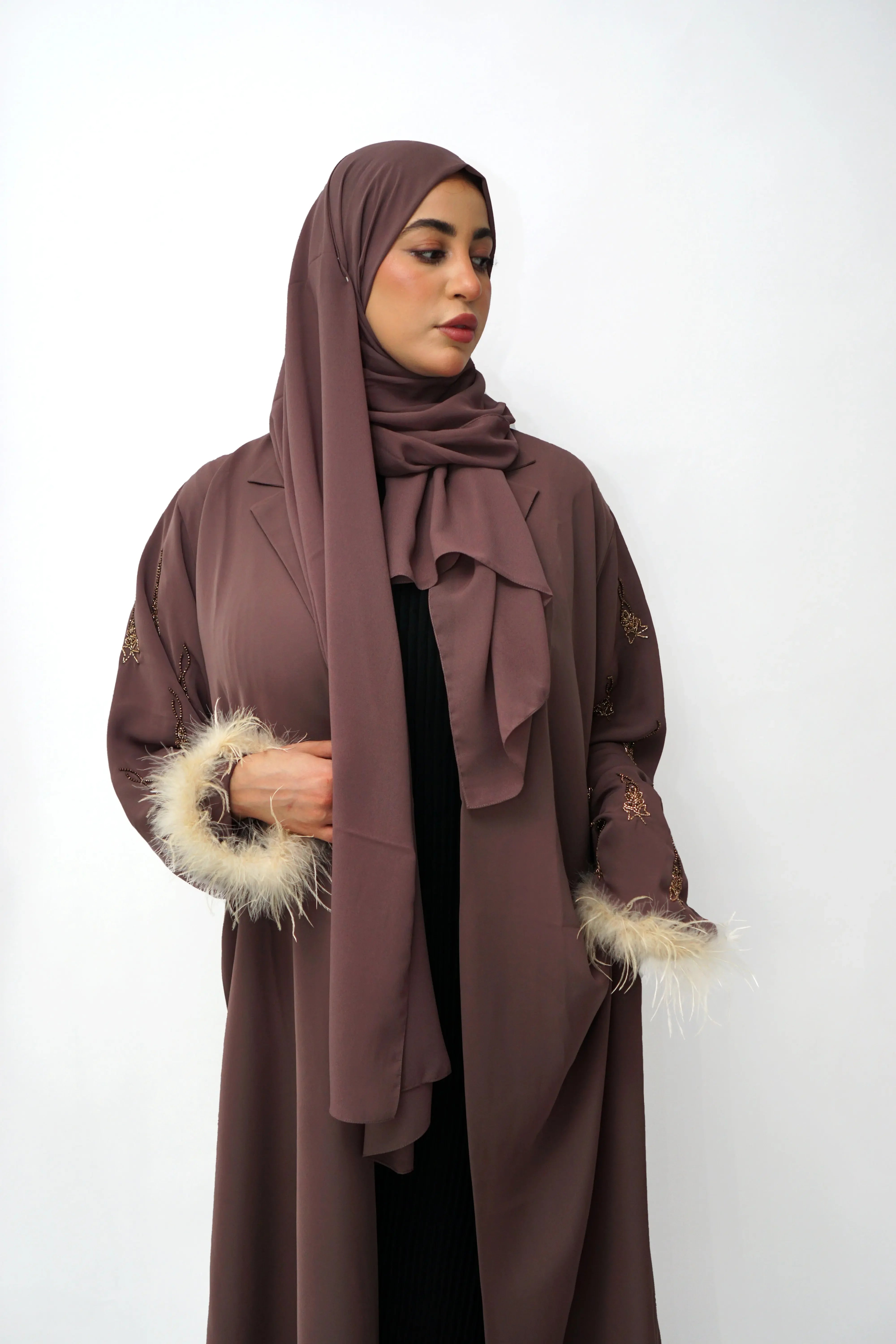 Elevate your modest wardrobe with our Elegant Mauve Abaya Jacket, designed to make a graceful statement. Crafted from high-quality, flowy fabric, this open-style abaya features delicate gold embellishments on the sleeves and luxurious faux fur cuffs for a touch of sophistication. The rich mauve tone adds warmth and elegance, making it perfect for both everyday wear and special occasions. Pair it with heels and a matching hijab for a complete refined look.