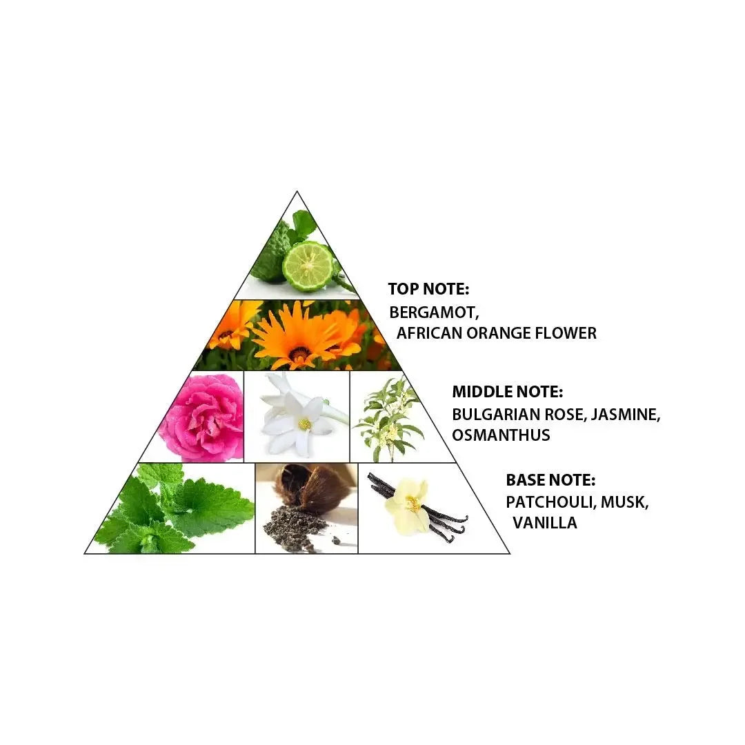 The heart blooms delicately with rose, jasmine, and osmanthus, weaving a floral tapestry of elegance. As the fragrance settles, the warm notes of patchouli, musk, and vanilla leave a captivating trail.
