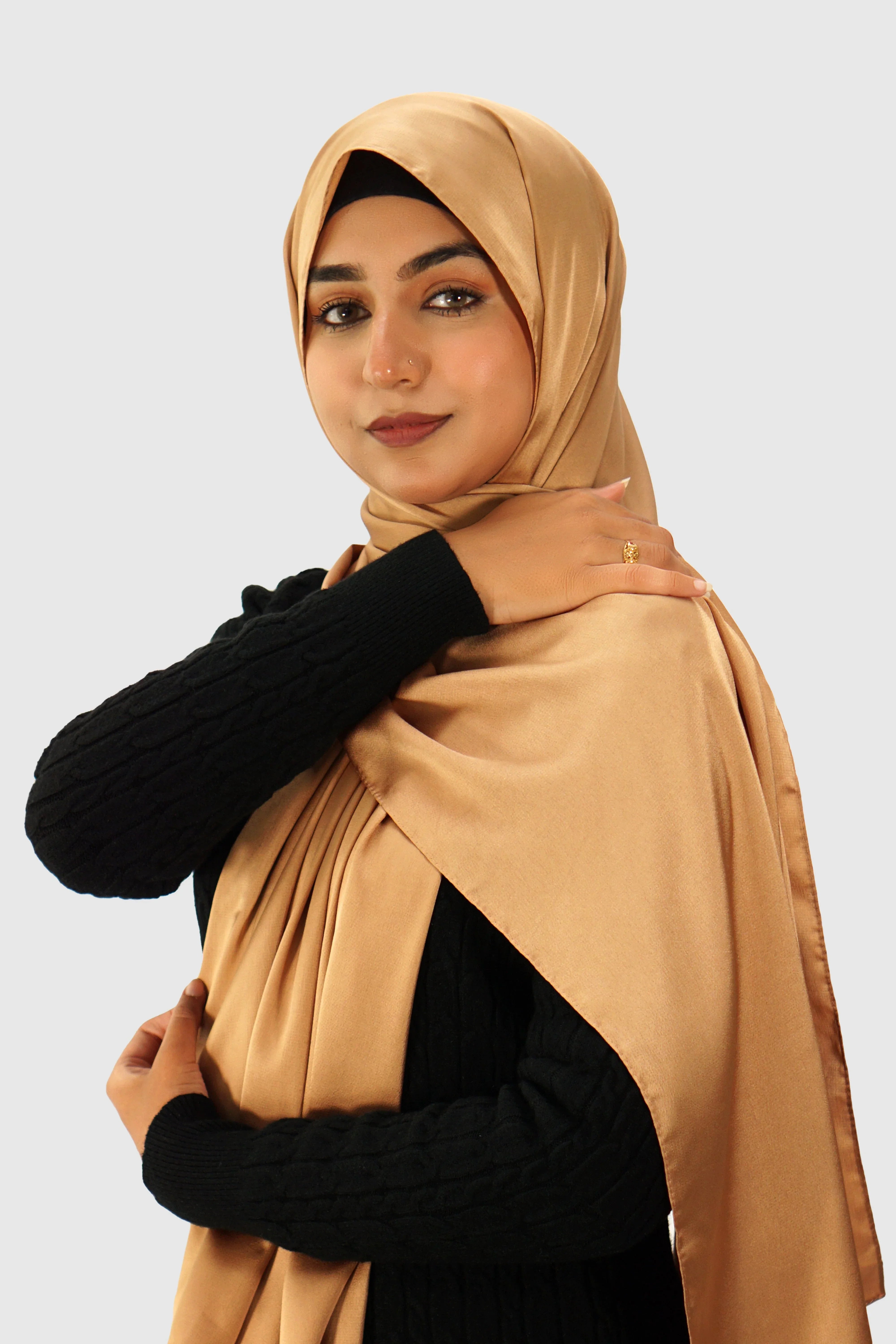 This hijab features a rich golden tone that adds a touch of glamour to any outfit. It suits various skin tones and complements a wide range of colors, so you can mix and match effortlessly. Whether you're attending a wedding or a casual gathering, the golden hue ensures that you stand out while maintaining a sophisticated appearance. Additionally, the shimmer of the satin catches the light perfectly, so you’ll always shine bright.