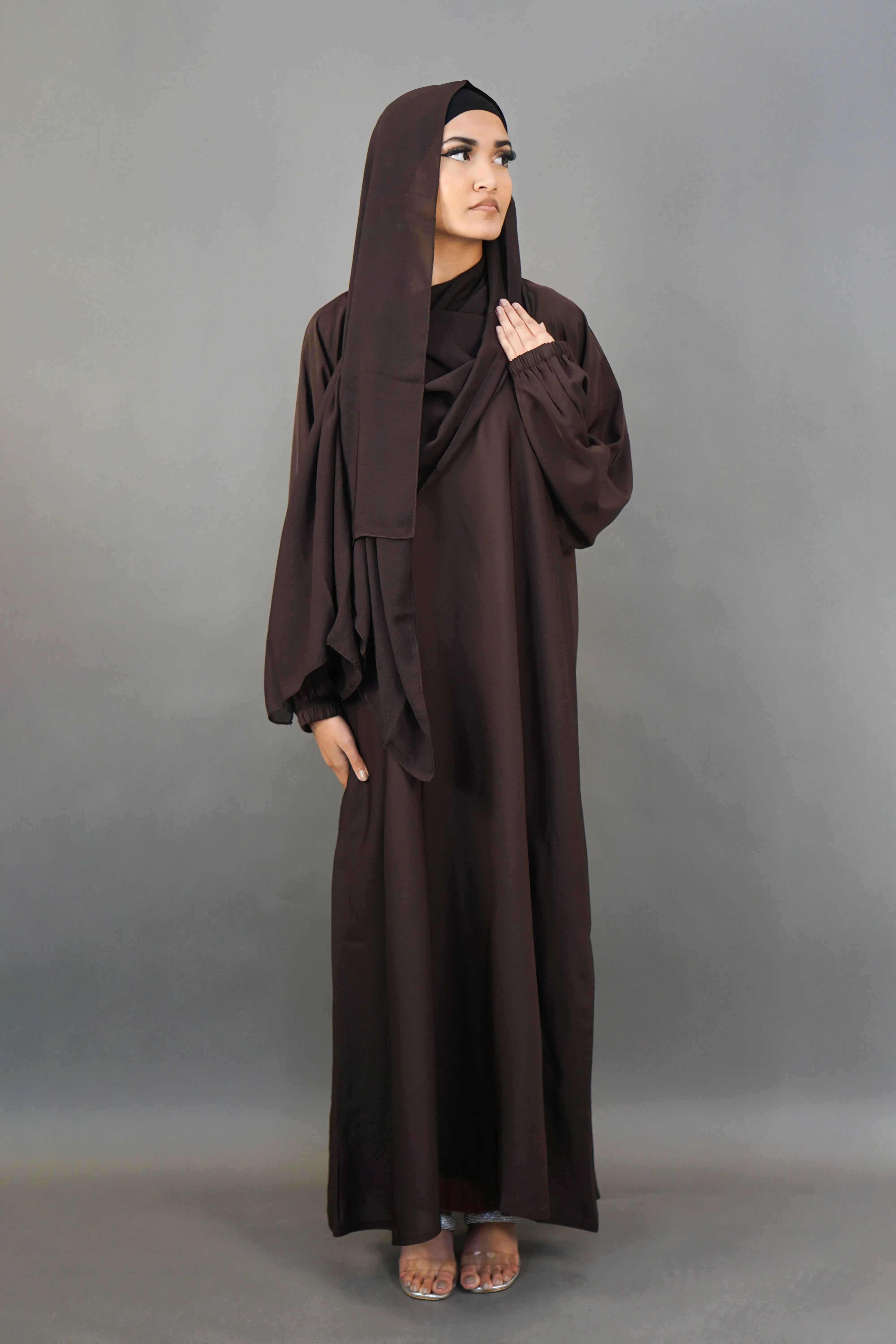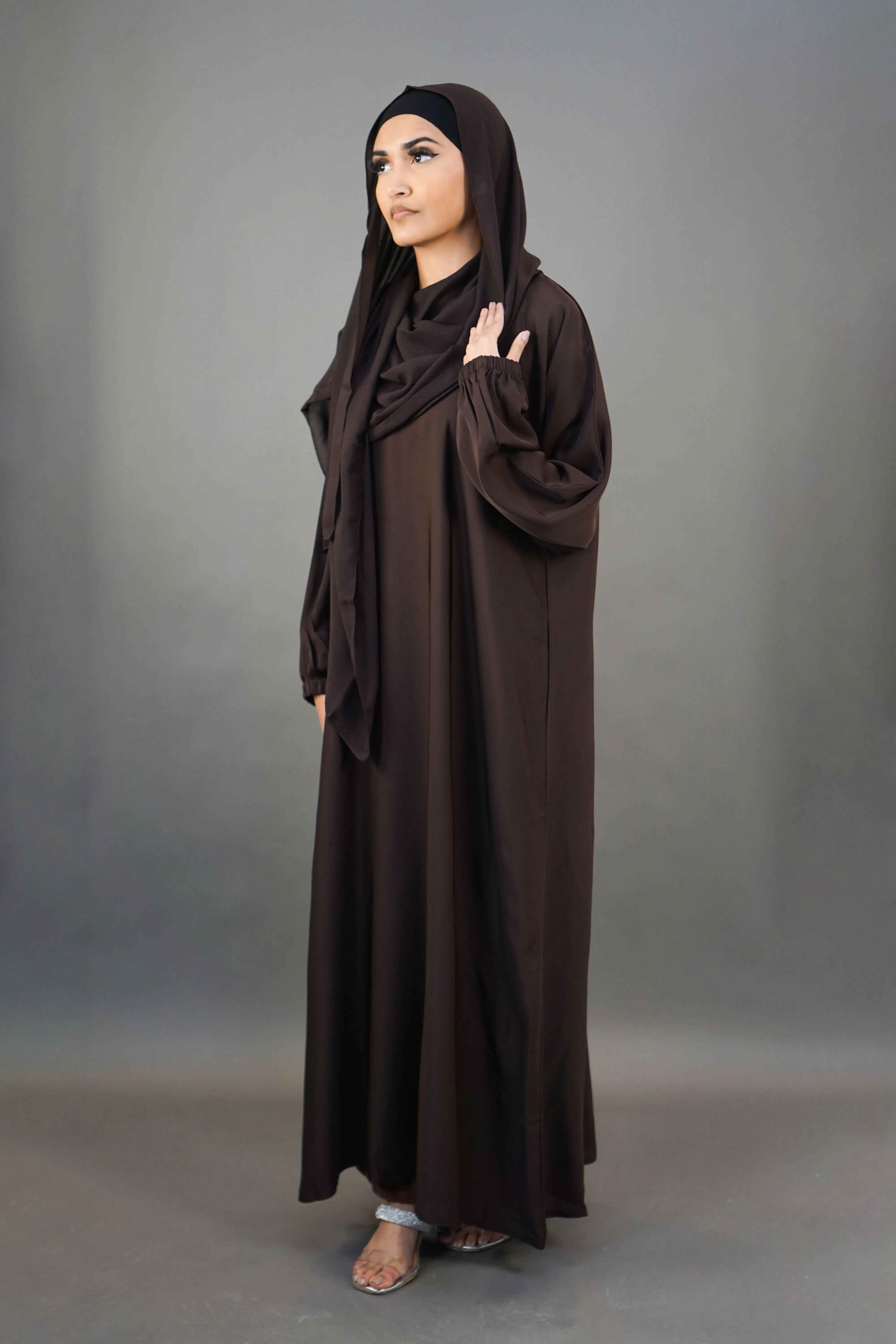 Experience everyday elegance with this Plain Elastic Sleeve Abaya, crafted from luxurious premium Nidha fabric for a smooth, lightweight, and breathable feel. The rich dark brown colour adds a timeless, sophisticated touch, making it a versatile piece suitable for both casual and special occasions.