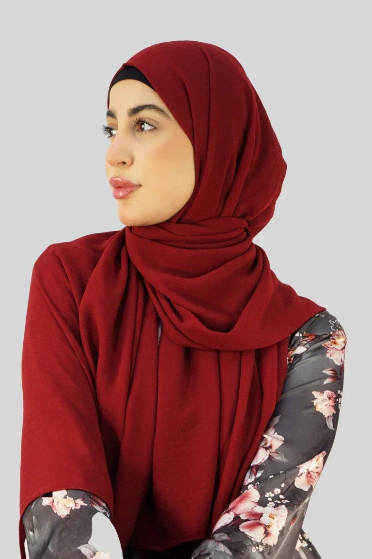 The stunning maroon color of this hijab adds a touch of elegance to any outfit. Maroon is a rich, warm color that complements various skin tones. It’s perfect for fall but also works beautifully any time of the year. Pair it with neutral tones for a chic look or add a pop of color to more vibrant outfits. Because of its attractive hue, it easily transitions from day to night, so you’ll always look stylish without extra effort.