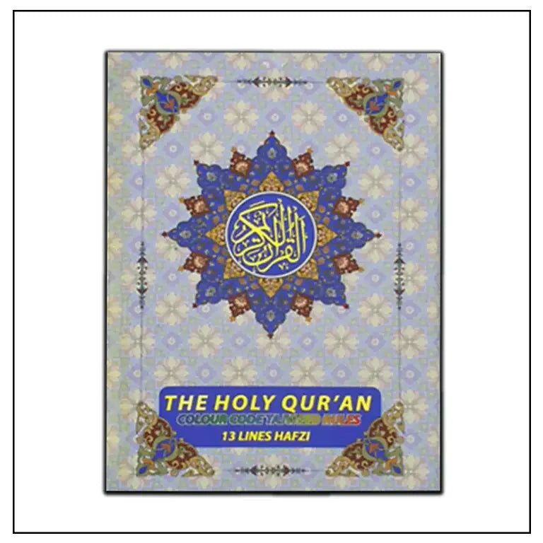 Quran Al Kareem Colour Coded Holy Quran 13 Line with Tajweed indicators marked with color text and having Tajweed rules describe in Engish as well. The particular style of Quran Majeed is known as Rangeen Tajweedi Holy Quran.