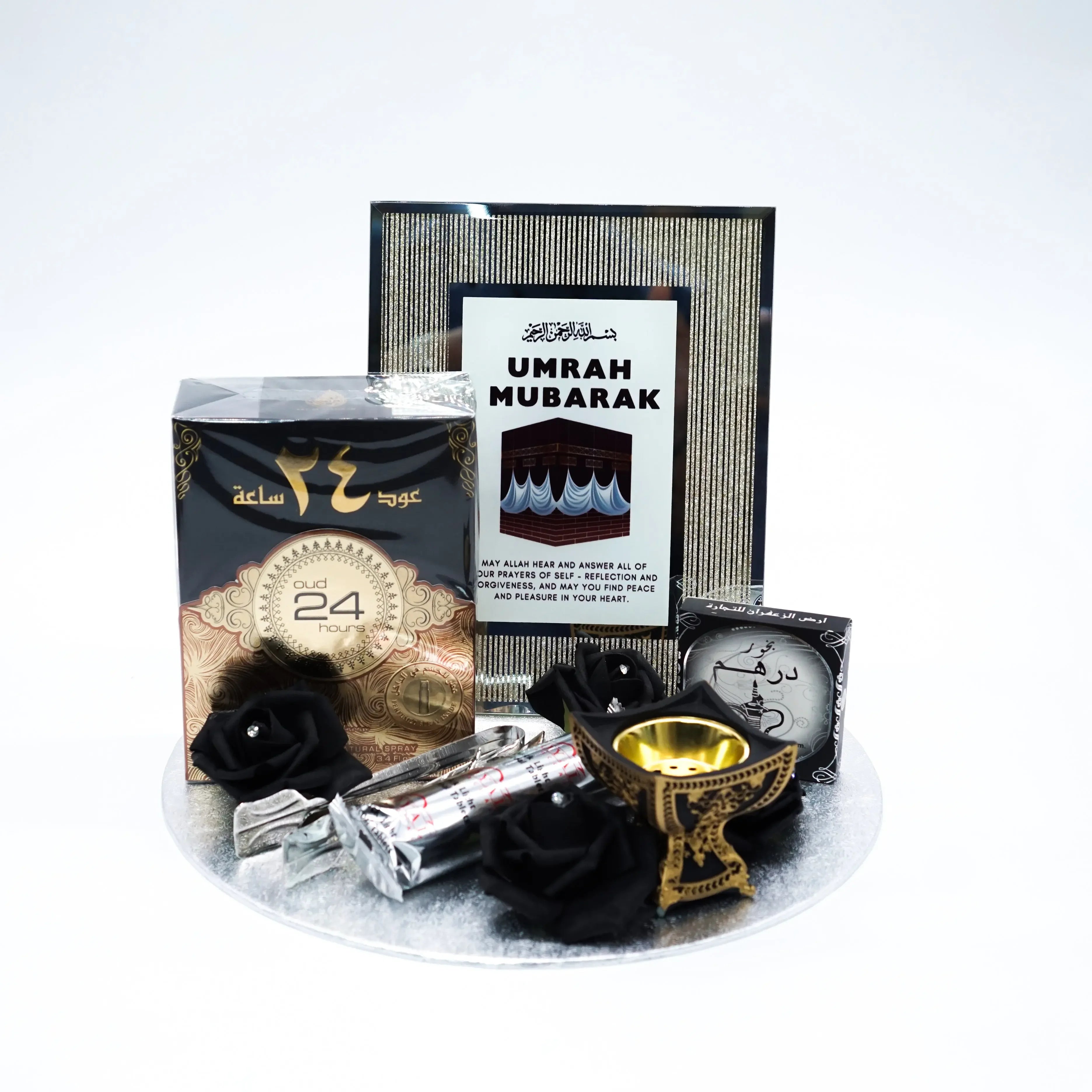 Celebrate the spiritual milestone of Umrah with this Luxury Umrah Mubarak Gift Hamper, thoughtfully curated to honor and cherish the journey of faith. Elegantly arranged, this premium set includes aromatic oud, a decorative incense burner, heartfelt Umrah Mubarak frame, and other elegant accessories, making it a perfect return gift or heartfelt gesture for loved ones.